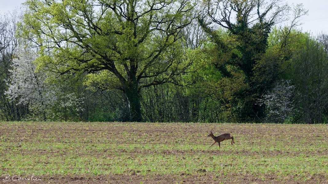 Un jeune chevreuil passe devant le vert tendre des frondaisons
