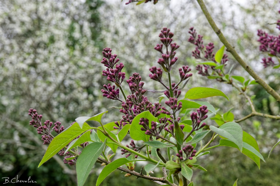 Les boutons du lilas se montrent devant le blanc des buissons