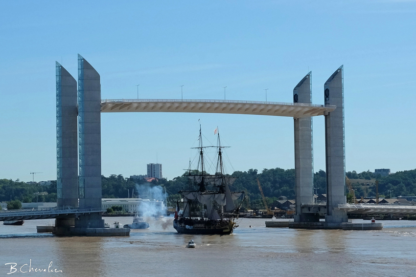 2015-28 Hermione Coups de canons en passant sous le pont levant « Chaban Delmas » à Bordeaux. Foule sur les quais. Grand soleil. L’Hermione rentre d’Amérique. Évaluez ceci : Articles similaires