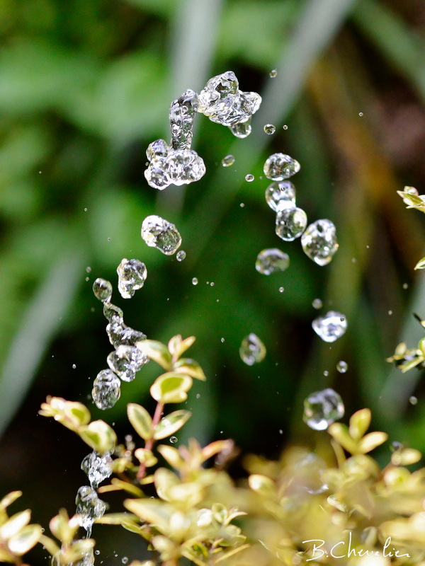 Petite fontaine Après les grandes fontaines voici une toute petite fontaine, juste un petit jet d’eau sous les frondaisons au jardin botanique de haute Bretagne.Prise au 1/1600 de seconde F4, 3200 ISO pour figer les gouttes.Évaluez ceci : Articles similaires