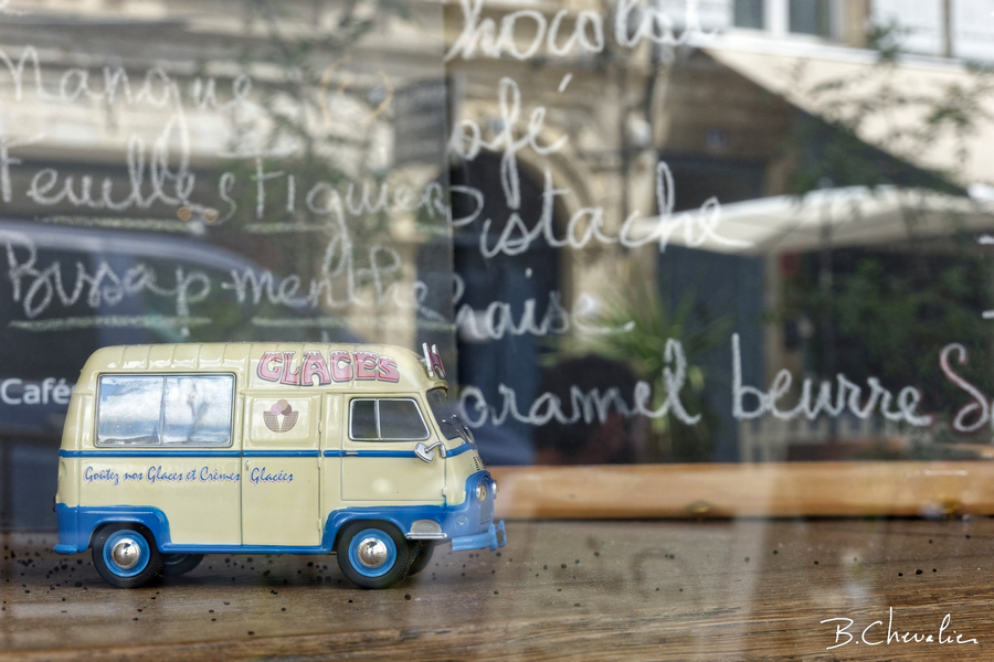 C’est la reprise aussi pour « Ma photo de la semaine », j’espère que vous avez passé d’excellentes vacances, dépaysantes, ensoleillées et chaudes tout en étant rafraîchissantes avec quelques dégustations de glaces au besoin ou juste pour le plaisir, bref je vous souhaite d’avoir pu vous remplir de bonne énergie.J’ai trouvé cette camionnette « Peugeot-marchand de glaces » dans une vitrine de pâtissier-glacier, je me rappelle en avoir vu des vraies comme celle-ci, une autre époque…