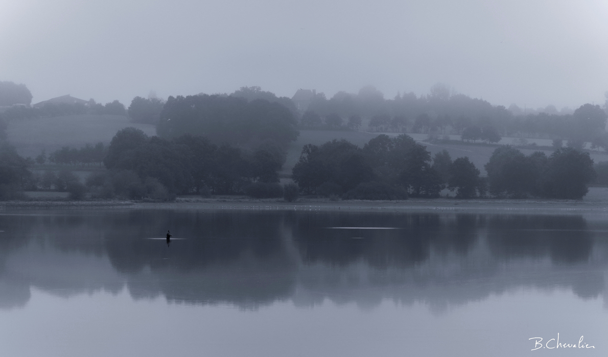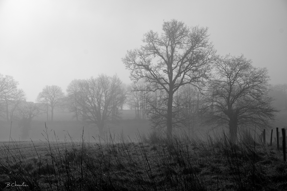 Ce matin le brouillard était au rendez vous. La Veuvre alimente l’étang de Chevré et ressort sous le nom de… Chevré. Drôle d’idée de changer de nom parce qu’on traverse un étang. Bon c’était du côté de la Veuvre et je pataugeais dans la boue depuis un petit moment, me régalant de cette ambiance de brume, lorsque, soudain….
